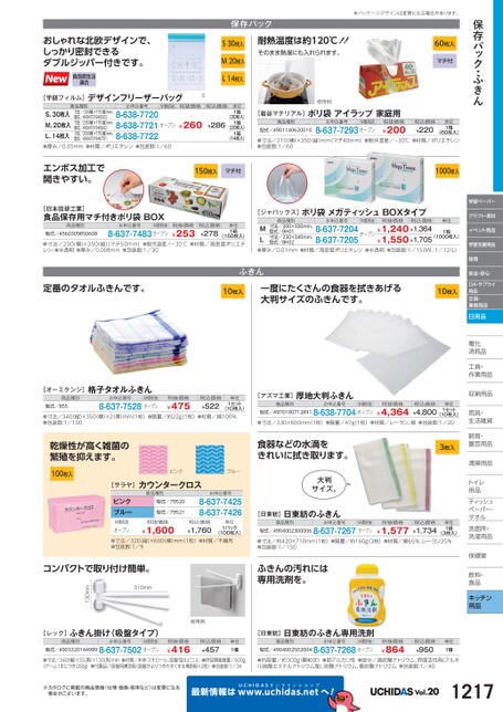 保存パック・ふきん学習ペーパークラフト・素材イベント用品学習支援用品保育安全・安心OA・サプライ用品文具・事務用品日用品電化化消耗品耗工具・具・作業用品業収納用品納雨具・具・生活雑貨活飼育・育・園芸用品芸清掃用品掃トイレレ用品品ティッシュティッシュペーパー・パタオルル洗面所・洗面所・洗濯用品濯保健室保健室飲料・料・食品食品キッチン用品※パッケージデザインは変更になる場合があります。おしゃれな北欧デザインで、しっかり密封できるダブルジッパー付きです。食品衛生法適合保存パック耐熱温度は約120℃!!そのまま熱湯にも入れられます。S30枚入M20枚入L14枚入[宇部フィルム]商品種別デザインフリーザーバッグお申込番号M価税抜税抜価格S税込価格S、30枚入M、20枚入L、14枚入●厚み/0.05mm●材質/ポリエチレン●包装数:1/60寸法/130横)×170(縦)mm、型式/4904701940503寸法/230横)×170(縦)mm、型式/4904701940602寸法/250横)×170(縦)mm、型式/49047019407018-638-77208-638-77218-638-7722オープン¥260¥286単位1箱1箱1箱(30枚入)(20枚入)(14枚入)60枚入マチ付税込価格¥220単位1箱(60枚入)使用例[岩谷マテリアル]ポリ袋アイラップ家庭用商品種別型式/4901140620010お申込番号M価税抜8-637-7293オープン税抜価格¥200●寸法/210(横)×350縦)mm(マチ40mm)●耐冷温度/-30℃●材質/ポリエチレン●包装数:1/60エンボス加工で開きやすい。150枚入マチ付1000枚入[日本技研工業]食品保存用マチ付きポリ袋BOX商品種別型式/4560309850608お申込番号M価税抜8-637-7483オープン税抜価格¥253税込価格¥278単位1箱●寸法/200(横)×350(縦)(マチ50mm)●耐冷温度/-30°Cレン●半透明●厚み/0.008mm●包装数:1/30(150枚入)●材質/高密度ポリエチ[ジャパックス]ポリ袋メガティッシュBOXタイプ商品種別お申込番号M価税抜税抜価格税込価格単位寸法/200×300mm、型式/BH01寸法/230×340mm、型式/BH02ML●厚み/0.01mm●材質/高密度ポリエチレン●半透明●包装数:1/15(M)、1/12(L)8-637-7204オープン¥1,240¥1,364¥1,550¥1,7058-637-7205(1000枚入)1箱定番のタオルふきんです。10枚入一度にたくさんの食器を拭きあげる大判サイズのふきんです。10枚入ふきん[アズマ工業]商品種別厚地大判ふきん型式/49701907128918-638-7704オープンお申込番号M価税抜税抜価格¥4,364税込価格¥4,800単位1セット(10枚入)●寸法/330×600mm(1枚)●質量/47g1枚)●材質/レーヨン、綿●包装数:1/20食器などの水滴をきれいに拭き取ります。3枚入大判サイズ。[日東紡]日東紡のふきん商品種別お申込番号M価税抜型式/49040023000068-637-7267オープン税抜価格¥1,577税込価格¥1,734単位1袋(3枚入)●寸法/約420×710mm(1枚)●質量/約160g3枚)●材質/綿65%、レーヨン35%●包装数:1/150ふきんの汚れには専用洗剤を。[日東紡]日東紡のふきん専用洗剤商品種別お申込番号M価税抜型式/49040025020048-637-7268オープン税抜価格¥864税込価格¥950単位1個[オーミケンシ]格子タオルふきん商品種別型式/855お申込番号M価税抜8-637-7528オープン税抜価格¥475税込価格¥522単位1セット(10枚入)●寸法/340(縦)×350(横)×2(厚)mm(1枚)●質量/約22g(1枚)●材質/綿100%●包装数:1/100乾燥性が高く雑菌の繁殖を抑えます。100枚入ピンクブルー[サラヤ]カウンタークロスピンクブルーM価税抜オープン商品種別型式/79520型式/79521お申込番号8-637-74258-637-7426税抜価格¥1,600税込価格¥1,760単位1パック(100枚入)●寸法/320縦)×600横)mm(1枚)●材質/不織布●包装数:1/9310mm130mmコンパクトで取り付け簡単。[レック]ふきん掛け(吸盤タイプ)商品種別お申込番号M価税抜型式/49033201449898-637-7502オープン使用例税抜価格¥416税込価格¥457単位1個●寸法/340(幅)×35(奥)×130(高)mm●材質/本体:スチロール、吸盤:塩化ビニル●許容積載質量/600g(アーム1本につき200g)●付属品/吸盤用補助板(吸盤がよりつきやすくする補助板×2枚)●包装数:1/36●内容量/約300g顆粒状)●弱アルカリ性●成分/過炭酸ナトリウム、界面活性剤(アルキル硫酸エステルナトリウム塩)、炭酸ナトリウム、重炭酸ナトリウム●包装数:1/40※カタログに掲載の商品情報(仕様・価格・税率など)は変更になる場合がございます。最新情報はUCHIDASww.uchidas.netwへ!Vol.201217