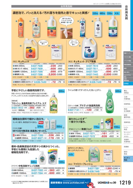 ●170mL●930mLお申込番号M価税抜8-637-7571オープン8-637-7572税抜価格¥161¥839税込価格¥177¥922単位1本1袋商品種別本体170mL詰替用930mL●●●M価税抜税抜価格税込価格単位オープン¥1,860¥2,0461本¥72¥791個●お申込番号8-637-73818-636-7449商品種別業務用業務用ボトル専用小分けキャップ⓱⓲[花王]ファミリーフレッシュ●内容量/4.5L●)●中性(●)●材質/ポリエチレン(●)●包装数:1/4●)、1/24(●)●中性●包装数:1/24(●⓭)、1/8(●⓮)※内容量は変更になる場合があります。※1P&G調べ(グリル汚れ)。汚れの度合いによります。油汚れスッキリ落とし洗い上がりもスッキリ。4.5L[P&Gジャパン]除菌ジョイUCHIDASww.uchidas.netwへ!Vol.201219台所用洗剤学習ペーパークラフト・素材イベント用品学習支援用品保育安全・安心OA・サプライ用品文具・事務用品日用品電化化消耗品耗工具・具・作業用品業収納用品納雨具・具・生活雑貨活飼育・育・園芸用品芸清掃用品掃トイレレ用品品ティッシュティッシュペーパー・パタオルル洗面所・洗面所・洗濯用品濯保健室保健室飲料・料・食品食品キッチン用品台所用洗剤※パッケージデザインは変更になる場合があります。濃密泡で、パッと洗える!汚れ落ちを指先と音でキュッと実感!220mL480mL1250mL4.5L●●●捨てるときはペコッとつぶせる新容器!(❸・❽)●●●●オレンジの香り。●グレープフルーツの香り。●●M価税抜オープンお申込番号8-637-76108-637-76118-637-75918-637-7443税抜価格税込価格単位¥230¥600¥890¥253¥660¥979¥2,800¥3,0801本商品種別本体220mL本体(ポンプ)480mL詰替用1250mL業務用4.5L●●●●1本¥230¥600¥890¥253¥660¥979¥2,800¥3,080税抜価格税込価格単位[花王]キュキュットクリア除菌M価税抜オープンお申込番号8-637-76088-637-76098-637-75908-637-7298[花王]キュキュット商品種別本体220mL本体(ポンプ)480mL詰替用1250mL業務用4.5L●●●●●中性●包装数:1/24(●)、1/12(●)、1/6(●)、1/4●)●弱酸性●包装数:1/24●)、1/12(●)、1/6●)、1/4●)商品種別業務用ボトル専用小分けキャップ●●材質/ポリエチレン●包装数:1/24お申込番号8-636-7449オープンM価税抜税抜価格税込価格単位1個¥72¥79商品種別業務用ボトル専用小分けキャップお申込番号8-636-7449オープンM価税抜税抜価格税込価格単位1個¥72¥79材質/ポリエチレン●包装数:1/24●●手肌にやさしい食器用洗剤です。手肌へのやさしさはそのままに洗浄力と泡立ちを大幅にアップし、こびりついたガンコな油汚れも強力に洗浄します。300mLライムの香りですっきりした洗い上がり。600mL[旭化成]フロッシュ食器用洗剤プレミアムユズお申込番号8-637-7612M価税抜¥398税抜価格¥382税込価格¥420単位1本商品種別300mL型式/4901670116953[ロケット石鹸]アドグッド食器用洗剤お申込番号M価税抜8-637-7131オープン税抜価格¥120税込価格¥132単位1本●弱酸性●成分/界面活性剤22%●包装数:1/18●内容量/600mL●中性●包装数:1/20植物油主原料で細かい泡立ち。スッキリ落ち、無添加だから安心。金たわしいらず※1一発でラク落ち。350mL●税抜価格¥336¥178税込価格¥369¥195単位1本1袋370mL●お申込番号M価税抜8-637-7308オープン8-637-8027¥180商品種別本体370mL詰替用350mL⓬⓫[ミヨシ石鹸]MIYOSHI無添加食器洗いせっけん●弱アルカリ性●包装数:1/20(●)、1/24●)香料・色素無添加の天然ヤシの実からつくった、手肌にも環境にも配慮した植物性洗剤です。●500mL●1500mLお申込番号8-637-75938-637-7594M価税抜¥440¥660税抜価格¥383¥600税込価格¥421¥660単位1本1袋商品種別本体500mL詰替用1500mL⓯⓰[サラヤ]中性洗剤ヤシノミ洗剤●中性●包装数:1/15⓯)、1/6(⓰)※カタログに掲載の商品情報(仕様・価格・税率など)は変更になる場合がございます。最新情報は