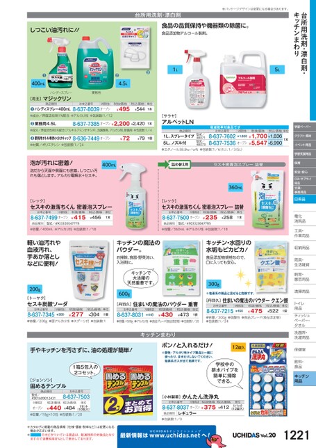 台所用洗剤・漂白剤・キッチンまわり学習ペーパークラフト・素材イベント用品学習支援用品保育安全・安心OA・サプライ用品文具・事務用品日用品電化化消耗品耗工具・具・作業用品業収納用品納雨具・具・生活雑貨活飼育・育・園芸用品芸清掃用品掃トイレレ用品品ティッシュティッシュペーパー・パタオルル洗面所・洗面所・洗濯用品濯保健室保健室飲料・料・食品食品キッチン用品台所用洗剤・漂白剤※パッケージデザインは変更になる場合があります。食品の品質保持や機器類の除菌に。食品添加物アルコール製剤。●1L5L●4.5L業務用しつこい油汚れに!!●400mLハンディスプレー[花王]マジックリン商品種別お申込番号M価税抜ハンディスプレー400mL●●成分/界面活性剤1%配合●アルカリ性●包装数:1/128-637-8039オープン税抜価格¥495税込価格¥544単位1本業務用4.5L●●成分/界面活性剤5%配合(アルキルアミンオキシド)、泡調整剤、アルカリ剤、除菌剤●包装数:1/48-637-7385オープン¥2,200¥2,4201本●業務用ボトル専用小分けキャップ8-636-7449オープン¥72¥791個●材質/ポリエチレン●包装数:1/24泡が汚れに密着!泡だから天面や側面にも密着。しつこい汚れも落とします。アルカリ電解水+セスキ。400mL[レック]セスキの激落ちくん密着泡スプレーお申込番号M価税抜8-637-7499オープン税抜価格¥415税込価格¥456単位1本[サラヤ]アルペットLN商品種別軽減税率対象品お申込番号1L、スプレータイプ5L、ノズル付●エタノール58.8w/w%●包装数:1/6(1L)、1/3(5L)8-637-76028-637-7536オープン型式/40071型式/40073M価税抜¥1,850税抜価格税込価格単位¥1,700¥1,836¥5,547¥5,9901本詰め替え用セスキ密着泡スプレー詰替360mL[レック]セスキの激落ちくん密着泡スプレー詰替お申込番号M価税抜8-637-7500オープン税抜価格¥235税込価格¥258単位1本商品種別型式/4903320047778●容量/400mL●アルカリ性●包装数:1/18商品種別型式/4903320047785●容量/360mL●アルカリ性●包装数:1/18軽い油汚れや血液汚れ、手あか落としなどに便利!200g[トーヤク]セスキ炭酸ソーダお申込番号8-637-7345M価税抜¥300税抜価格¥277税込価格¥304単位1個キッチンの魔法のパウダー。お掃除、食器・野菜洗い、入浴剤に。キッチンで大活躍の天然重曹です。600g[丹羽久]住まいの魔法のパウダー重曹お申込番号8-637-8031M価税抜¥448税抜価格¥430税込価格¥473単位1袋●容量/200g●弱アルカリ性●スプーン付●包装数:1●容量/600g●アルカリ性●食品グレード(食品添加物)●包装数:1/20キッチン・水回りの水垢もピカピカ!食品添加物規格なので、口に入っても安心。300g※塩素系の製品と混ぜると危険です。[丹羽久]住まいの魔法のパウダークエン酸お申込番号8-637-7215M価税抜¥498税抜価格¥475税込価格¥522単位1袋●容量/300g●弱酸性●食品グレード(食品添加物)●包装数:1/24手やキッチンを汚さずに、油の処理が簡単!1箱5包入の2コセット。[ジョンソン]固めるテンプル商品種別型式/4901609012431お申込番号8-637-7503M価税抜オープン税抜価格¥440税込価格¥484単位1セット(10包入)●容量/18g×10包●包装数:1/20※カタログに掲載の商品情報(仕様・価格・税率など)は変更になる場合がございます。※のオビがついている商品は、軽減税率の対象品となりますので消費税率8%として表示しております。キッチンまわりポン!と入れるだけ!※酸性・アルカリ性タイプ製品と一緒に使ったり、まぜたりしないでください。塩素系ガスが出て危険です。12錠入学校中の排水パイプを簡単に掃除できる。[小林製薬]かんたん洗浄丸お申込番号M価税抜税抜価格8-637-8037オープン¥375商品種別レギュラー税込価格¥412単位1パック(12錠入)●包装数:1/9最新情報はUCHIDASww.uchidas.netwへ!Vol.201221
