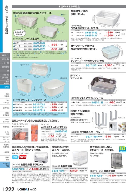 ●寸法/420(幅)×305(奥)×230(高)mm●材質/ポリプロピレン●容量/12L●包装数:1/1270mm●洗桶角型びにくいステンレス製。86mm7mm01[ヒマラヤ化学]バブル水切りセットホワイト355mm255mmM価税抜商品種別お申込番号型式/0381小大●寸法/小:355(幅)×255(奥)×130(高)mm、大:425(幅)×315奥)×150高)mm●材質/ポリプロピレン●包装数:小:1/30、大:1/208-637-7430オープン8-637-7431税込価格¥968¥1,300¥1,430¥880型式/0383税抜価格単位1セット305mm230mmmm024税込価格¥1,672単位1個箸やフォークが置けるカゴ付きの水切りセット。[イノマタ化学]クリアーフード付水切りセットM型商品種別型式/0050お申込番号M価税抜8-617-2171¥1,850税抜価格¥1,520130mmm350mmmm29083mm120mm290m350mm組み合わせて使えます。120mm●ケース350mm288mmM価税抜税抜価格税込価格単位型式/D-0532型式/D-5033●●●寸法/350(幅)×290(奥)×120(高)mm(●)、350(幅)×288(奥)×120(高)mm(●)、350(幅)×290(奥)×83(高)mm(●❸)●材質/ポリプロピレン●色/ホワイト(●、●❷)、クリアー(●❸)●包装数:1/5※表記の寸法から若干の誤差が生じることがあります。¥646オープン1個¥731¥665¥588かごケースカバー●お申込番号8-637-70848-637-72958-637-7375[アサヒ化成]スマイル水切り商品種別型式/D-0531水回りに最適な水切りかごとケース。●かご水切り・水まわり用品お手軽サイズの水切りセット。●カバー200mm150mm141mm●コーナーmm341203mm●タワシラックmm011170mm[金伊工業]シェイプラインシリーズ商品種別たわし入れ●寸法/170(幅)×110(奥)×70(高)mm●材質/18-8ステンレス●包装数:1/40●8-637-7138オープン¥980¥1,078型式/H-5023お申込番号M価税抜税抜価格税込価格単位1個折りたたみ時税込価格¥891使用例単位1個[山崎実業]ポリ袋ホルダープレート商品種別型式/6534お申込番号M価税抜8-637-7464¥1,100税抜価格¥810120mm165mm折りたたみ可能な簡易ゴミ箱。ポリ袋を掛けて調理中にでる野菜クズや資源ゴミを、その場でポイ!●寸法/120(幅)×95奥)×165高)mm●材質/本体:スチール(ユニクロメッキ・粉体塗装)、キャップ:シリコン樹脂●包装数:1/24mm053税抜価格¥190¥180¥480税込価格¥209¥198¥528単位1個7mm29お申込番号8-637-70828-637-70818-637-7213M価税抜オープン商品種別型式/0085型式/0556型式/0045タワシラックコーナー洗桶角型●●●[イノマタ化学]フィーリングシリーズ●寸法/200(幅)×107(奥)×86(高)mm(●❹)、203(幅)×143(奥)×141(高)mm(●❺)、297(幅)×350奥)×150高)mm(●❻)●材質/ポリプロピレン●包装数:1三角コーナーがいらない自立型水切りゴミ袋です。穴あきタイプでしっかり水切りができます。使用例[ネクスタ]ごみっこポイスタンドタイプE商品種別型式/3110150お申込番号8-638-7706税抜価格¥180M価税抜オープン●寸法/180(縦)×250横)×120(底マチ)mm●質量/135g●材質/ポリエチレン●包装数:1/10税込価格¥198単位1袋(25枚入)高温熱風とAg抗菌加工で清潔乾燥。省スペース・コンパクト設計。温風式となっています。抗菌横幅約20cmの省スペース設計。ふたが取り外しできて食器が入れやすい。置き場所に困らない「省スペース・たて型」。80cmロング排水ホースつき。[タイガー]お申込番号食器乾燥器サラピッカM価税抜税抜価格税込価格単位8-638-7729オープン¥14,080¥15,4881台商品種別型式/DHG-T401WY●寸法/502(幅)×372(奥)×376(高)mm●質量/約3.8kg●材質/フタ:ポリスチレン、水受け:ポリスチレン(抗菌加工)、本体・フタとめ・カゴ取っ手・はし立て:ポリプロピレン、フィルターケース:ABS樹脂、タイマーツマミ:PBT、食器カゴ:ステンレス●消費電力/305W●大容量収納(大皿(26cm)も収納可能●色/ピュアホワイト●包装数:11222Vol.20[小泉成器]食器乾燥器お申込番号M価税抜税抜価格税込価格8-638-7700オープン¥12,800¥14,080単位1台商品種別型式/KDE-7500/W●寸法/約202幅)×445奥)×328高)mm●質量/約3kg●材質/本体・ふた:ポリプロピレン、かご:ステンレス●電源/AC100V(50/60Hz)●消費電力/220W(ヒーター210W、モーター10W)●安全装置/温度ヒューズ167℃●温風温度/90℃(周囲温度30℃の場合)●コードの長さ/1.6m●タイマースイッチ/60分●付属品/はし立て、排水ホース●包装数:1/2[象印マホービン]食器乾燥器お申込番号M価税抜税抜価格税込価格単位8-637-7352オープン¥16,370¥18,0071台商品種別型式/EY-KB50-HA●寸法/405(幅)×335奥)×505高)mm●質量/4.1kg●材質/ポリプロピレン、ポリスチレン、塩化ビニル他●電源/AC100V50/60Hz)●消費電力/290W●食器量目安/5人分●包装数:1水切り・水まわり用品学習ペーパークラフト・素材イベント用品学習支援用品保育安全・安心OA・サプライ用品文具・事務用品日用品電化電化消耗品消耗品工具・工具作業用品作業用収納用品収納用雨具・雨具生活雑貨生活雑飼育・飼育園芸用品園芸用清掃用品清掃用トイレトイ用品用品ティッシュティッシュペーパー・タオルタオル洗面所・洗面所・洗濯用品洗濯用保健室保健室飲料・飲料食品食品キッチン用品