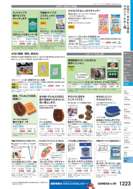 水切り・水まわり用品・スポンジ・たわし類学習ペーパークラフト・素材イベント用品学習支援用品保育安全・安心OA・サプライ用品文具・事務用品日用品電化化消耗品耗工具・具・作業用品業収納用品納雨具・具・生活雑貨活飼育・育・園芸用品芸清掃用品掃トイレレ用品品ティッシュティッシュペーパー・パタオルル洗面所・洗面所・洗濯用品濯保健室保健室飲料・料・食品食品キッチン用品水切り・水まわり用品※パッケージデザインは変更になる場合があります。ネットタイプで細かなゴミもキャッチします。35枚入不織布タイプでゴミをしっかりキャッチ!20枚入小さなゴミもしっかりキャッチ!●網目が細かいストッキングタイプなので、小さなゴミも逃しません。●伸縮自在の素材で、容器にぴったりフィットします。●容器にヌメリをつきにくくします。[ジャパックス]水切りネット三角コーナー用商品種別型式/PR61お申込番号8-637-7529税抜価格¥208M価税抜オープン(35枚入)●寸法/280(幅)×250(高)mm●質量/3.6g●材質/ポリエチレン●包装数:1/40税込価格¥228単位1袋[クレハ]ダストマン▽サンカク20枚入商品種別型式/4901422360207お申込番号8-638-7736単位1袋税抜価格¥250税込価格¥275M価税抜オープン(20枚入)●寸法/193×10×311mm●質量/62g●材質/パルプ30%、ポリエステル70%、抗菌成分:銅ゼオライト●三角コーナー用●包装数:1/80100枚入[有本カテイ]ストッキング水切ネット商品種別お申込番号M価税抜税抜価格税込価格単位型式/45603098520778-637-7552オープン¥460¥50645603098520848-637-7553浅型排水口排水口・三角コーナー兼用●寸法/浅型排水口:140(幅)×60(奥)×280高)mm、排水口・三角コーナー兼用:140(幅)×70奥)×300高)mm●材質/ポリエステル・ポリウレタン●包装数:1/100(100枚入)型式/1袋水切り簡単、便利、衛生的。●家庭科での食器や調理器具の水切りに、図工科での筆や筆洗器、粘土板の水切りに。●セルローススポンジで吸水性、抱水性に優れています。スポンジ・たわし類調理器具のガンコな汚れも素早くスッキリ。使用例使用例黄色[日本インソール工業]水切りマット大判商品種別お申込番号M価税抜税抜価格税込価格単位型式/20-0830黄色黄緑●寸法/450(縦)×310(横)×8(厚)mm●質量/100g●材質/セルロース(天然植物繊維素)●包装数:1/1008-617-22748-617-2275¥630型式/20-0831¥693¥7001枚ガンコな汚れもぴかぴかに。黄緑[スリーエムジャパン]スコッチ・ブライトナイロンたわし商品種別型式/A-11Sお申込番号M価税抜8-637-8046オープン税抜価格¥174税込価格¥191単位1個●寸法/115(幅)×225(長)×10(厚)mm●質量/13g●材質/ナイロン不織布●包装数:1/30鍋物、ザルなどの洗浄、研磨に!まな板・ザルなどの凹凸面や目詰まりもきれいに洗い落とします。自然にやさしく熱油に強い純植物性繊維を使用。手のひらに収まるミニサイズです。熱や油に強いヤシの実繊維を使用。※天然素材のため、繊維クズが出ます。水はねしにくいやわらかタワシ。ゴムの働きで水がはねにくく、型がくずれません。[亀の子束子西尾商店]亀の子束子1号お申込番号8-637-8051[アイセン]パームたわしお申込番号8-637-7481税抜価格¥360M価税抜オープン●寸法/80(幅)×110(長)×48(厚)mm●包装数:1/10税込価格¥396単位1個M価税抜オープン税抜価格¥109税込価格¥119単位1個●寸法/80幅)×105長)×45(厚)mm●質量/50g●材質/コイアファイバー●包装数:1/5使用例[アズマ工業]まめろくタワシ6個入商品種別お申込番号税抜価格8-638-7703型式/4970190482459M価税抜オープン●寸法/80(幅)×55(長)×32(厚)mm●質量/22g(1個)●材質/ココナッツファイバー、鉄(亜鉛メッキ)●包装数:1/60税込価格¥768¥699単位1袋(6個入)[アズマ工業]はねないたわしポリプロ商品種別お申込番号型式/49701904800808-637-7513M価税抜オープン税抜価格¥290税込価格¥319単位1個●寸法/80(幅)×115(長)×50(厚)mm●質量/35g●材質/ポリプロピレン●包装数:1/100先端まで毛があるからスミが洗いやすい。かためのブラシでゴシゴシ洗える。プロが選んだ業務用金タワシ。手触りがソフトで自由な形に!●360°植毛のブラシで細かなところをお掃除できます。●こびりついた汚れを落とすスクレーパー付き。斜め植毛だからスミまでしっかり洗えます。フライパンの頑固な汚れを落としたり錆びた金具を綺麗にする金タワシ。使用例サビや汚れを落とし均一に磨き上げます。すべりにくい凹凸グリップ。使用例[アズマ工業]ぐるぐる洗えるミニブラシ3色組[アズマ工業]ゴシゴシブラシプチマミー商品種別型式/4970190485931お申込番号8-637-7462商品種別型式/4970190484026お申込番号8-637-7332税抜価格¥528税込価格¥580M価税抜オープン●寸法/25(幅)×25(奥)×160(高)mm●質量/8g●材質/グリップ:ポリプロピレン、ブラシ:ナイロン●包装数:1/40(3個入)単位1組税抜価格¥528税込価格¥580M価税抜オープン●寸法/70(幅)×125(長)×35厚)mm●質量/55g●材質/ブラシ・グリップ:ポリプロピレン●耐熱温度/70℃●包装数:1/20単位1個[ボンスター]カールケートステンレスたわし商品種別型式/K-135お申込番号8-637-7359M価税抜オープン税抜価格¥150税込価格¥165単位1