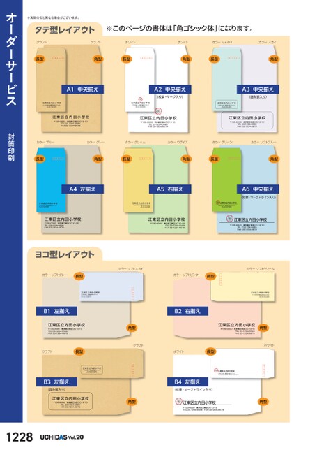 ※実物の色と異なる場合がございます。タテ型レイアウト※このページの書体は「角ゴシック体」になります。クラフト長型クラフトホワイトホワイトカラーミズイロカラースカイ角型長型角型長型角型A1中央揃えA2中央揃え(校章・マーク入り)A3中央揃え(囲み罫入り)江東区立内田小学校〒135-000東京都江東区〇〇10-10TEL03-1234-589FAX03-1234-6679江東区立内田小学校〒135-0000東京都江東区〇〇10-0TEL03-234-5589FAX03-234-679江東区立内田小学校〒135-0000東京都江東区〇〇10-10TEL03-234-589FAX03-1234-679江東区立内田小学校〒135-0000東京都江東区〇〇10-10TEL03-1234-5589FAX03-1234-6679江東区立内田小学校〒135-0000東京都江東区〇〇10-10TEL03-1234-5589FAX03-1234-6679江東区立内田小学校〒135-0000東京都江東区〇〇10-10TEL03-1234-5589FAX03-1234-6679カラーブルーカラーグレーカラークリームカラーウグイスカラーグリーンカラーソフトブルー長型角型長型角型長型角型A4左揃えA5右揃えA6中央揃え(校章・マーク+ライン入り)江東区立内田小学校〒135-000東京都江東区〇〇10-0TEL03-234-5589FAX03-234-679江東区立内田小学校〒135-0000東京都江東区〇〇10-0TEL03-234-5589FAX03-234-6679江東区立内田小学校〒135-0000東京都江東区〇〇10-10TEL03-234-589FAX03-1234-679江東区立内田小学校〒135-0000東京都江東区〇〇10-10TEL03-1234-5589FAX03-1234-6679江東区立内田小学校〒135-0000東京都江東区〇〇10-10TEL03-1234-5589FAX03-1234-6679江東区立内田小学校〒135-0000東京都江東区〇〇10-10TEL03-1234-5589FAX03-1234-6679ヨコ型レイアウトカラーソフトグレー長型カラーソフトピンク長型カラーソフトスカイカラーソフトクリーム江東区立内田小学校〒135-0000東京都江東区〇〇10-0TEL03-234-5589FAX03-1234-679江東区立内田小学校〒135-0000東京都江東区〇〇10-0TEL03-234-5589FAX03-234-6679B1左揃え江東区立内田小学校〒135-0000東京都江東区〇〇10-10TEL03-1234-5589FAX03-1234-6679B2右揃え角型クラフト江東区立内田小学校〒135-0000東京都江東区〇〇10-10TEL03-1234-5589FAX03-1234-6679角型ホワイトクラフト長型ホワイト長型江東区立内田小学校〒135-000東京都江東区〇〇10-0TEL03-1234-5589FAX03-234-6679B3左揃え(囲み罫入り)江東区立内田小学校〒135-0000東京都江東区〇〇10-10TEL03-1234-5589FAX03-1234-6679江東区立内田小学校〒135-0000東京都江東区〇〇10-10TEL03-1234-589FAX03-1234-679B4左揃え(校章・マーク+ライン入り)角型江東区立内田小学校〒135-0000東京都江東区〇〇10-10TEL03-1234-5589FAX03-1234-6679角型オーダーサービス封筒印刷1228Vol.20