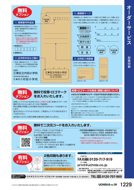 オーダーサービス封筒印刷無料オプション①.郵便番号枠追加◎郵便番号枠の印刷されていない封筒に郵便番号枠を印刷することができます。◎お入れする郵便番号枠は文字と同じ印刷色となります。※長型3号、長型4号、長型40号には郵便番号枠があらかじめ朱色で印刷されており、郵便番号枠のお色は変更できませんのでご注意ください。A郵便枠ありB郵便枠なし③.区市町村名など縮小◎学校・施設名のうち、「○○市立」「学校法人」などの属性表記を縮小して印刷することができます。【通常】江東区立内田小学校【区市町村名部分縮小】江東区立内田小学校料金別納郵便②.郵便物マーク◎郵便物によく使用するマーク(表示)をご希望により、印刷します。◎マーク類の位置に指定がある場合、ご希望場所をご指定ください。◎文字と同じ印刷色となります。A〜H:封筒下部、I・J:封筒左上)A■■■■在中※4文字までご希望の内容を入れることができます。B折曲厳禁C冊子小包DE親至展急FG令和年年月月日日H差出人IJ料金後納郵便料金別納郵便④.住所記入用罫線◎文字と同じ印刷色となります。◎2行と3行からお選びください。年月日江東区立内田小学校〒135-0000東京都江東区〇〇10-10TEL03-1234-5589FAX03-1234-6679江東区立内田小学校〒135-000東京都江東区〇〇10-10TEL03-1234-5589FAX03-234-679【2行タイプ】江東区立内田小学校〒135-000東京都江東区〇〇10-0TEL03-1234-589FAX03-234-6679【3行タイプ】無料オプション無料で校章・ロゴマークをお入れいたします。封筒レイアウトA2・A6・B4には赤い点線の位置に校章・ロゴマークを無料でお入れいたします。(P.1228・下記参照)見本(原稿)が到着した日の翌日に校正のFAXまたはメールをお送りいたします。見本以外のレイアウトもできます。ご希望のレイアウト見本を添えてご注文ください。★お送りいただいた見本(原稿)は基本的に返却いたしません。校章・ロゴマークの見本(原稿)送付について★お入れする校章やロゴマークは以下の方法でお送りください。①データ送信:校章・ロゴマークなどをデータでお持ちの場合はPDF形式・JPG形式・PNG形式・AI形式・EPS形式にてEメールに添付してご送信ください。※データの形式や解像度により使用できない場合もございます。上記の方法をおすすめします。①ができない場合は、必ず現物or他の印刷物(ロゴマーク入り)を以下の条件にてお送りください。●スキャンデータ送付の場合:600dpi以上推奨●FAX送信の場合:なるべく大きくコピーしたものをFAX見本(原稿)が鮮明でない場合や複雑な形状で使用できない場合は制作日数が多くかかる場合があります。•対応可能な画像形式:PNG形式・JPEG形式など→解像度は300dpi以上を推奨。低解像度の場合、読み取り精度が落ちる可能性があります。※現物のスキャンや写真は対応不可となります。※校正PDFで読み取れた場合でも実際に印刷を行った際に読み取れる保障ができません。ウチダスプリントサービスセンターご注文FAX0120-757-959FAXprint@uchida.co.jpデータ送信見本(原稿)送付先※データ・FAXの送信に不備があった場合、こちらにご送付ください。〒135-0016東京都江東区東陽2-3-25住生興和東陽町ビル1階(株)内田洋行ウチダスお問い合せセンター宛二次元コード生成ソフトなどで生成したデータご支給のみ対応可となります。生成の際は下記の通りご対応ください。•モノクロニ階調•生成ファイル形式について推奨形式:AI形式・EPS形式・SVG形式→ベクターデータのため、拡大・縮小しても画質が劣化せず、印刷に最適です。2色印刷も承ります。有料で2色での印刷も承ります。刷り分ける内容を別途指示ください。価格は1227ページをご覧ください。校10江東区立内田小学校〒135-0000東京都江東区〇〇10-10TEL03-234-589FX03-234-679※黒・赤・青の中から2色をお選びください。学197〇86小区5-田江33内都11立東0XL0AT無料で二次元コードをお入れいたします。無料オプション一例有料オプション東3江〒区0-印刷サービスに関するお問い合わせはウチダスプリントサービスセンター受付時間:午前9時〜午後5時(土・日・祝日を除く)TEL0120-757-969※カタログに掲載の商品情報(仕様・価格・税率など)は変更になる場合がございます。Vol.201229