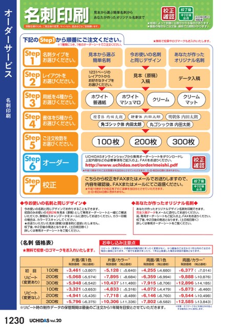 名刺印刷別製仕様のため、ご発注後の変更、キャンセル、返品などはご容赦願います。見本から選ぶ簡単名刺からあなたが作ったオリジナル名刺まで校正確認校了後中2日後出荷★地域によって到着に日数がかかる場合があります。★離島の場合はご注文後、最短で2週間かかります。(土日祝日除く)(宅配便)下記のStep1から順番にご注文ください。※1種類につき、1枚のオーダーシートでご注文ください。★無料で校章やロゴマークもお入れいたします。Step1Step2Step3Step4Step5Step6Step7名刺タイプをお選びください。見本から選ぶ簡単名刺今お使いの名刺と同じデザインあなたが作ったオリジナル名刺レイアウトをお選びください。1231ページのレイアウトからお好きなタイプをお選びください。見本(原稿)入稿データ入稿用紙を4種からお選びください。ホワイト普通紙ホワイトマシュマロクリームクリームマット書体を5種からお選びください。ご注文枚数をお選びください。オーダー校正角ゴシック体内田太朗明朝体内田太朗100枚200枚300枚UCHIDASオンラインショップから専用オーダーシートをダウンロードし上記内容などの必要事項をご記入の上、FAXをお送りください。http://www.uchidas.net/order/meishi.pdf★午前10時までのご注文到着分を当日分とさせていただきます。土・日・祝日は日数に含まれません。こちらから校正をFAXまたはメールでお送りしますので、内容を確認後、FAXまたはメールにてご返信ください。★午前10時までの校正完了のご返事を当日分とさせていただきます。土・日・祝日は日数に含まれません。校正確認校了後中2日後出荷オーダーサービス名刺印刷◆今お使いの名刺と同じデザイン◆今お使いの名刺と同じデザインでお作りすることもできます。初回のみお使いの名刺2枚を見本(原稿)として専用オーダーシートと一緒にご郵送いただくか、鮮明なスキャンデータをメールに添付してお送りください。カラー印刷の場合は、カラーでスキャンしてください。★お送りいただいた見本(原稿)は基本的に返却いたしません。校了後、中2日後の発送となります。(土日祝日除く)詳しくは専用オーダーシートをご覧ください。◆あなたが作ったオリジナル名刺◆あなたが作ったオリジナルデザイン名刺を印刷できます。完全入稿データをメールに添付してお送りください。尚、専用オーダーシートもご記入の上、FAXをお送りください。校了後、中2日後の発送となります。(土日祝日除く)詳しくは専用オーダーシートをご覧ください。〈名刺価格表〉お申し込み注意点★無料で校章・ロゴマークをお入れいたします。リピート(変更なし)の価格は印刷内容にまったく変更がなく、かつ最後のご注文から1年以内のご注文の場合に適用となります。一部でも変更があったり、1年以上経過した場合は初回の価格となります。初回・(変更)(変更)片面/黒1色税抜価格(税込価格)¥3,461(¥3,807)¥5,068(¥5,574)¥5,948(¥6,542)¥3,321(¥3,653)¥4,941(¥5,435)¥5,796(¥6,375)片面/カラー※税抜価格(税込価格)¥5,128(¥5,640)¥7,895(¥8,684)¥10,437(¥11,480)¥4,833(¥5,316)¥7,718(¥8,489)¥10,306(¥11,336)両面/黒1色税抜価格(税込価格)¥4,255(¥4,680)¥6,359(¥6,994)¥7,915(¥8,706)¥4,072(¥4,479)¥6,146(¥6,760)¥7,802(¥8,582)100枚200枚300枚100枚200枚300枚※リピート時の制作データの保管期間は最後のご注文から1年間を目安とさせていただきます。1230Vol.20両面/カラー※税抜価格(税込価格)¥6,377(¥7,014)¥9,888(¥10,876)¥12,896(¥14,185)¥5,873(¥6,460)¥9,544(¥10,498)¥12,585(¥13,843)※校章・ロゴマークなどを黒以外の色とする場合はこれに該当します。