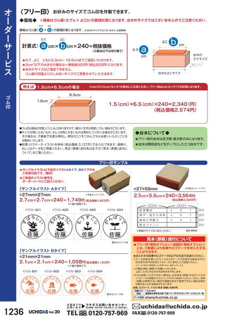 〈フリー印〉お好みのサイズでゴム印を作製できます。◆価格◆※価格はゴム面(たてa×よこb)の面積計算になります。台木のサイズではございませんのでご注意ください。価格はゴム面(×)の面積計算になります。注:台木のサイズではございません(右図参照)たてaよこb計算式:たてaよこcm×bcm×240=税抜価格(小数点以下は切り捨て)★たて、よこともに0.3cm〜15.0cmまでご指定いただけます。★2cm2以下の大きさの場合は一律税抜503円(税込553円)になります。★台木のサイズはご指定できません。ゴム部の印面より少し大きいサイズでご用意させていただきます。たてacmよこbcm台木のよこサイズ台木のたてサイズ例えば1.5cm×6.5cmの場合※mm(ミリ)とcm(センチ)の単位にご注意ください。フリー印はcm(センチ)での計算になります。6.5cm1.5cm1.5(cm)×6.5(cm)×240=2,340(円)(税込価格2,574円)●ゴム印は商品の性質上「にじみ」がありますので、細かい文字は判読しづらい場合がございます。●サイズが特に小さいもの、もしくは特に大きいものは押印にコツがいる場合がございます。その場合は、不要紙で何度か押印し、押印のコツをつかんでからお使いいただくことをお勧めいたします。●校章・ロゴマーク・イラストを有料(税込価格3,127円)でお入れできます。清刷り、もしくはデータをご用意ください。見本(原稿)送付先は右下の「見本(原稿)送付について」をご覧ください。フリー印サンプル◆台木について◆★フリー印の台木は正方形・長方形のみになります。★台木は間伐材などをチップにしたエコ台木です。★サンプルイラストは下記のイラストAタイプ、Bタイプのみご利用可能です。無料)★ご希望のイラスト番号を、オーダーシートにご記入ください。オーダーサービスゴム印【サンプルイラストAタイプ】●27mm×27mm2.7cm×2.7cm×240=1,749円(税込価格1,923円)※写真はイメージです。※1個の価格です。イラストA01イラストA02イラストA03イラストA04書体:丸ゴシック体【サンプルイラストBタイプ】●21mm×21mm2.1cm×2.1cm×240=1,058円(税込価格1,163円)※1個の価格です。イラストB01イラストB02イラストB03イラストB04書体:丸ゴシック体1236Vol.20お電話でのお問い合せTELウチダスお問い合せセンター受付時間:午前9時〜午後5時(土・日・祝日を除く)0120-757-969●27×55mm2.7cm×5.5cm×240=3,564円(税込価格3,920円)※写真はイメージです。〇〇ミリ〇〇ミリ〇ミリ〇ミリ〇ミリ〇ミリ※罫線のサイズをご記入ください。書体:明朝体見本(原稿)送付について★フリー印(有料オプション)・浸透印(有料オプション)には、ご希望により校章やロゴマークをお入れすることができます。★お入れする校章やロゴマークは以下の方法でお送りください。①データ送信:校章・ロゴマークなどをデータでお持ちの場合はPDF形式またはPNG形式にてEメールに添付してご送信ください。※データの形式や解像度により使用できない場合もございます。②ご郵送:原則、清刷りでお願いいたします。上記①②のどちらかの方法をおすすめします。③FAX送信:①②ができない場合は、必ず見本(原稿)をなるべく大きくコピー(A4用紙大ぐらい)してFAXでお送りください。ただし、見本(原稿)が鮮明でない場合や複雑な形状で使用できない場合は制作日数が多くかかる場合がございます。校章、ロゴマーク、イラスト見本(原稿)の送付先清刷りの郵送データ送信〒520-0047滋賀県大津市浜大津1丁目1-13ウチダススタンプサービスセンター宛stamp@uchida.co.jpuchidas@uchida.co.jp0120-757-959FAX