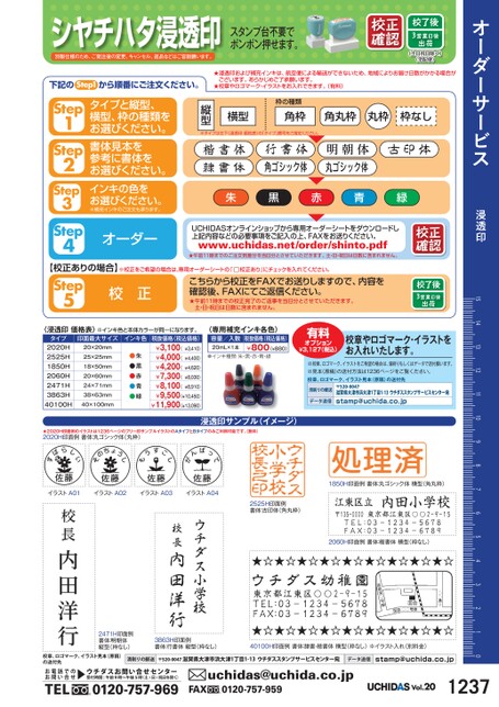 オーダーサービス浸透印1514131211109876543210角丸枠丸枠枠なし※タイプは左下〈浸透印価格表〉の「タイプ」番号をご指定ください。枠の種類角枠横型縦型シヤチハタ浸透印別製仕様のため、ご発注後の変更、キャンセル、返品などはご容赦願います。スタンプ台不要でポンポン押せます。校正確認校了後3営業日後出荷(土日祝日除く)(宅配便)下記のStep1から順番にご注文ください。★浸透印および補充インキは、航空便による輸送ができないため、地域によりお届け日数がかかる場合がございます。あらかじめご了承願います。★校章やロゴマーク・イラストをお入れできます。(有料)タイプと縦型、横型、枠の種類をお選びください。書体見本を参考に書体をお選びください。インキの色をお選びください。※補充インキのご注文も承ります。オーダーStep1Step2Step3Step4朱黒赤青緑UCHIDASオンラインショップから専用オーダーシートをダウンロードし上記内容などの必要事項をご記入の上、FAXをお送りください。www.uchidas.net/order/shinto.pdf★午前11時までのご注文到着分を当日分とさせていただきます。土・日・祝日は日数に含まれません。校正確認校了後3営業日後出荷【校正ありの場合】※校正をご希望の場合は、専用オーダーシートの「校正あり」にチェックを入れてください。Step5校正こちらから校正をFAXでお送りしますので、内容を確認後、FAXにてご返信ください。★午前11時までの校正完了のご返事を当日分とさせていただきます。土・日・祝日は日数に含まれません。※インキ色と本体カラーが同一になります。〈浸透印価格表〉タイプ印面最大サイズ2020H2525H1850H2060H2471H3863H40100H20×20mm25×25mm18×50mm20×60mm24×71mm38×63mm40×100mmインキ色●朱●黒●赤●青●緑税抜価格(税込価格)¥3,410)¥4,400)¥4,620)¥8,030)¥8,910)¥3,100(¥4,000(¥4,200(¥7,300(¥8,100(¥9,500(¥10,450)¥11,900(¥13,090)〈専用補充インキ各色〉容量/入数20mL×1本税抜価格(税込価格)¥800(¥880)●インキ種類朱・黒・赤・青・緑有料オプション¥3,127(税込)校章やロゴマーク・イラストをお入れいたします。※校章、ロゴマーク、イラストをご希望の場合は、清刷りもしくはデータで送付願います。※見本(原稿)の送付方法は1236ページをご覧ください。校章、ロゴマーク、イラスト見本(原稿)の送付先清刷りの郵送データ送信〒520-0047滋賀県大津市浜大津1丁目1-13ウチダススタンプサービスセンター宛stamp@uchida.co.jp★2020H印面例のイラストは1236ページのフリー印サンプルイラストのAタイプとBタイプのみご利用可能です。無料)2020H印面例書体:丸ゴシック体(丸枠)浸透印サンプル(イメージ)イラストA01イラストA02イラストA03イラストA042525H印面例書体:古印体(角丸枠)1850H印面例書体:丸ゴシック体横型(角丸枠)2060H印面例書体:楷書体横型(枠なし)2471H印面例書体:明朝体縦型(枠なし)3863H印面例書体:行書体縦型(枠なし)40100H印面例書体:隷書・楷書体横型(枠なし)※イラスト入れ(別料金)校章、ロゴマーク、イラスト見本(原稿)の送付先お電話でのお問い合せ清刷りの郵送〒520-0047滋賀県大津市浜大津1丁目1-13ウチダススタンプサービスセンター宛データ送信stamp@uchida.co.jpTELウチダスお問い合せセンター受付時間:午前9時〜午後5時(土・日・祝日を除く)0120-757-969uchidas@uchida.co.jp0120-757-959FAXVol.201237