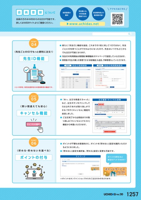 会員登録について会員の方のみWEBからの注文が可能です。詳しくはWEBサイトよりご確認ください。会員登録は無料先生個人もWEB会員登録できる担当販売店より請求書が届く▶www.uchidas.netアクセスはこちらPOINT04〈先生ごとのIDでもっと便利に注文!〉先生ID機能■■■新たに「先生ID」機能を追加。これまでの1校に対して1IDではなく、先生ごとにIDを持つことができるようになったので、先生はいつでもどこからでも注文が可能になります。先生IDの利用開始は管理者(事務職員)のマイページで設定していただきます。管理者が先生の購入を管理できる「承認機能」も追加。予算管理もしていただけます。管理者先生ID管理画面管理者先生ID利用開始設定※小・中学校、特別支援学校のお客様専用の機能です。POINT05〈買い間違えても安心〉キャンセル機能キャンセル依頼POINT06■『あっ、注文を間違えちゃった』注文履歴・キャンセル依頼など、注文ボタンをクリックして5分以内であれば取り消しができる「今すぐキャンセル」機能を追加しました。■ご注文完了から出荷前までの取り消しは「キャンセルリクエスト」機能から申請いただけます。■ポイントが不要なお客様向けに、ポイントを「貯めない」設定を選択いただけるようになりました。〈貯める・貯めないを選べる〉■「貯めない」設定を選択後、「貯める」設定に変更も可能です。ポイントの付与マイページポイントを貯めると景品をゲットできます!※ポイントはオンラインショップからのご注文のみ付与されます。Vol.201257