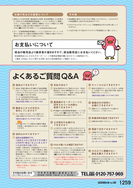 お届け先などの変更についてその他●移転などの住所変更、電話番号の変更、担当者異動などの変更はP.1262の「お客様情報変更連絡シート」にてお早めにご連絡ください。ご注文と同時に、変更のご連絡をいただいた場合には、手続きの都合上、お届け日が変わる場合がございます。(FAX:0120-757-959、メール:uchidas@uchida.co.jp)●万一、「お客様情報変更連絡シート」とご注文のオーダーシートを別々に送信された場合は変更後の内容にて商品をお届けできない場合がございますのでご注意ください。お支払いについて●有効期限を過ぎたカタログはご利用いただけません。このカタログの有効期限は、2027年2月28日までです。●カタログおよびオンラインショップ掲載商品以外はお取り扱いしておりません。●ご注文の前にP.1263の「ウチダスご利用規約」をご覧ください。担当の販売店より請求書が届きますので、担当販売店にお支払いください。担当販売店とは、カタログオーダーシートの販売店情報の欄に記されている販売店です。ご請求、お支払いなどに関するお問い合せは担当販売店にご確認ください。よくあるご質問Q&A?キャンセルはできますか?商品が出荷前はキャンセルできます。出荷後は、お手数ですが、商品が届き次第、返品のお手続きを行ってください。[商品の返品・交換について]➡P.1260登録以外の住所にお届けできますか?登録されている住所以外へのお届けはできません。ご了承ください。到着日時を指定できますか?到着日時は指定できません。ご了承ください。電話で注文できますか?お電話でのご注文は承っておりません。オーダーシートにご記入後FAXしていただくか、オンラインショップからご入力いただくか、2通りからお選びください。[オーダーシート]➡カタログ裏表紙カタログに掲載のない商品を購入できますか?ウチダスでは、カタログおよびオンラインショップ掲載商品のみのお取り扱いとなっております。掲載のない商品はご購入いただけませんので、ご了承ください。QAQAQAQAQA支払方法は?担当の販売店からのご請求となります。担当の販売店は、カタログ裏表紙のオーダーシート右上に印字されています。ご請求、お支払に関することは担当販売店にご確認ください。裏表紙のオーダーシートに印字されている内容は変更できますか?P.1262のお客様情報変更連絡シートにご記0120-757-959、メール:入の上、FAX:uchidas@uchida.co.jpをご送付ください。土日祝日のお届けはできますか?土日祝日のお届け・出荷はお休みとさせていただいております。土日祝日のご注文は、翌営業日のご注文として受付させていただきます。詳しくはお届け日と配送エリアをご確認ください。[商品のお届けについて]➡P.1258FAXが届いたか確認できますか?FAXを流したか忘れてしまった、FAXのエラーメッセージが出たなど、FAX送信確認が必要な場合は、必ずウチダスお問い合せセンター(0120-757-969)までお電話ください。※ご注文が重複する可能性がありますので、上記のような場合は必ずお問い合せください。※再FAXを流す場合は、オーダーシートの「再FAX欄」に必ずチェックを入れてください。QAQAQAQA返品はできますか?返品をご希望の場合は、P.1261の「返品依頼書」をコピーしてご記入いただいたものを、ウチダスお問い合せセンターまでFAXまたはメールしてください。(FAX:0120-757-959、メール:uchidas@uchida.co.jp)その後、返品可能かどうかの返信をいたします。[商品の返品・交換について]➡P.1260離島などからの注文は受付していますか?はい、お受けいたします。ただし場所によりお届け日数がかかりますのでご了承ください。[商品のお届けについて]➡P.1258※が付いている商品は沖縄及び離島、北海道(一部の商品のみ)はサービス対象外となります。送料はかかりますか?送料は全国無料です。1回あたりのご注文をできる限り3,000円(税込)以上にまとめていただけますと幸いです。お客様への配送料は、担当販売店とウチダスが負担しております。少量での配送は、梱包材の増加や発送トラックの増便など地球環境保護という観点からも大きな影響が出てまいります。誠に恐れ入りますが、できるだけご協力をお願い申し上げます。(ご注文が3,000円(税込)以下でも承っております。)※離島のお客様は一部商品について送料がかかります。QAQAQAその他のお問い合せ何かご不明点ございましたら…ウチダスお問い合せセンター受付時間:午前9時〜午後5時(土・日・祝日を除く)TEL0120-757-969Vol.201259