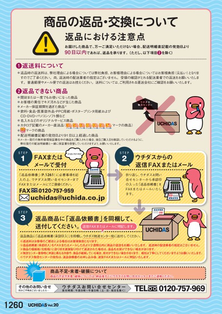 商品の返品・交換についてご利用に関するご案内返品における注意点お届けした商品で、万一ご満足いただけない場合、配送明細書記載の発効日より90日以内であれば、返品を承ります。(ただし、以下項目❷を除く)!❶返送料について●返品時の返送料は、弊社理由による場合については弊社負担、お客様理由による場合についてはお客様負担(元払い)となりますのでご了承ください。尚、返送時の配送業者の指定はございません。受領の確認がとれる配送業者での返送をお願いいたします。普通郵便やメール便での返送はお控えください。送料については、ご利用される運送会社にご確認をお願いいたします。❷返品できない商品●開封または一度でもお使いになった商品●お客様の責任でキズ汚れなどが生じた商品●メーカー保証期間を過ぎた商品※●飲料・食品・医薬部外品・PPC用紙・ポスタープリンタ用紙およびCD・DVD・パソコンソフト類など●名入れなどのオリジナルサービス商品●カタログ記載のメーカー直送品(●※返品不可マークの商品6マークの商品)ウチダス物流センター●配送明細書記載の発効日より91日以上経過した商品※メーカー発行の無料修理保証書在中の商品をご購入された場合、後日ご購入日を確認していただけるように、弊社発行の配送明細書と一緒に保証書を保管していただけますよう、お願いいたします。STE1PFAXまたはメールで受付0120-757-959S「返品依頼書」(P.1261)に必要事項を記入の上、ウチダスお問い合せセンターまでFAXまたはメールにてご連絡ください。返品依頼書FAX0120-757-959uchidas@uchida.co.jpTE2Pウチダスからの返信FAXまたはメール折り返し、ウチダスお問い合せセンターから承認印の入った「返品依頼書」をFAXまたはメールいたします。STE3P返品商品に「返品依頼書」を同梱して、送付してください。返信FAXまたはメールに明記します。返品商品に「返品依頼書(承認印入)」を同梱し、ウチダス物流センター宛に送付してください。※返送料はお客様のご都合による場合はお客様負担となります。※返品依頼書(承認印入)をFAXまたはメールした日より2週間以内に商品の返送をお願いいたします。返送時の配送業者の指定はございません。※商品の個装箱(化粧箱)に送り状を直接貼り付けて返送された場合は、返品をお受けできない場合があります。※物流センター着荷時に申請と異なる内容や、商品が破損している場合、受付ができない場合があります。梱包は丁寧にしてくださいますようお願いいたします。※ウチダス物流センターの宛先は、返品依頼書のお申し込み後、返信FAXまたはメールに明記いたします。商品不足・未着・破損について商品の不足や未着、破損については、納品後すぐにウチダスお問い合せセンターまでご連絡ください。その他のお問い合せ何かご不明点ございましたら…ウチダスお問い合せセンター受付時間:午前9時〜午後5時(土・日・祝日を除く)TEL0120-757-9691260Vol.20
