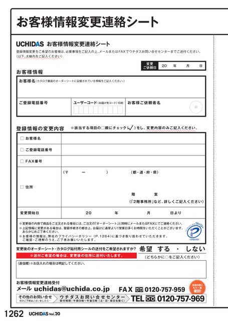 お客様情報変更連絡シートお客様情報変更連絡シート登録情報変更をご希望のお客様は、必要事項をご記入の上、メールまたはFAXでウチダスお問い合せセンターまでご送付ください。(以下、太線内をご記入ください)お客様情報お客様名(カタログ裏面のオーダーシートに記載されている情報をご記入ください。)変更ご依頼日20年月日ご登録電話番号ユーザーコード(お届け先コード)10桁お客様ご依頼者名印登録情報の変更内容※該当する項目の□欄にチェック()をし、変更内容のみご記入ください。□お客様名□ご登録電話番号□FAX番号□住所(〒ー)(都・道・府・県)階室(「2階事務所」など、詳しくご記入ください)変更開始日20年月日より※変更後の内容で商品をご注文される場合には、ご注文の「オーダーシート」と同時にメールまたはFAXにてご連絡ください。※上記情報に変更がある場合は、登録手続きの都合上、お届けに通常より1営業日多くお時間をいただくことがございます。あらかじめご了承ください。※お客様の情報は、弊社のプライバシーポリシー(P.1264)に基づき取り扱わせていただきます。ご確認・ご理解のうえ、ご了承お願いいたします。変更後のオーダーシート・カタログ貼付用シールの送付をご希望されますか?※送付ご希望の場合は、変更後の住所に送付いたします。希望する・しない(どちらかに◯をご記入ください)〈通信欄〉※お店入れの場合は明記してください。お客様情報変更連絡受付メールuchidas@uchida.co.jpFAX0120-757-959送信の前にもう一度確認!その他のお問い合せ何かご不明点ございましたら…ウチダスお問い合せセンター受付時間:午前9時〜午後5時(土・日・祝日を除く)TEL0120-757-9691262Vol.20