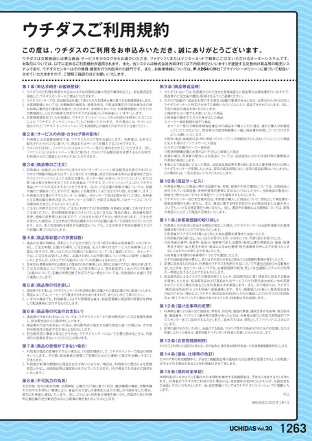 ウチダスご利用規約この度は、ウチダスのご利用をお申込みいただき、誠にありがとうございます。ウチダスは文教施設に必要な商品・サービスをカタログからお選びいただき、ファクシミリまたはインターネットで簡単にご注文いただけるオーダーシステムです。お取引については、以下に定めるご利用規約が適用されます。また、当システムは株式会社内田洋行(以下内田洋行といいます)が運営する文教向け商品等の販売システムであり、ウチダスセンターはその管理・運営を行う内田洋行の部門です。また、お客様情報については、P.1264の弊社「プライバシーポリシー」に基づいて取扱いさせていただきますので、ご理解ご確認のほどお願いいたします。第1条(申込手続き・お客様登録)第9条(商品等返品等)1.ウチダスのご利用を希望される方には予め利用申込書に所定の事項を記入し、担当販売店を1.ウチダスにおいては、利用者からのご注文を受信後直ちに商品等の出荷処理を行いますので、経由して、ウチダスセンターにご提出いただきます。2.ウチダスセンターでは、担当販売店を通じて寄せられた利用申込書に基づきお客様登録をします。3.お客様登録においては、文教施設の施設名、経営主体名、ご担当部署及びご担当者名その他利用申込書所定の事項をお届けいただきます。本規約においては、お客様登録をいただいた文教施設もしくはその経営主体をウチダスの利用者(以下利用者といいます)とします。4.お客様登録を完了した利用者は、ウチダスオンラインショップから別途お手続をいただくことにより、ウチダスオンラインショップ」もご利用いただけます。その場合には、サイト上に提示された「ウチダスオンラインショップご利用規約」が適用されますのでご注意ください。第2条(サービスの内容・カタログ等の配布)1.利用者にはお客様登録完了後、ウチダスカタログ等をお届けします。利用者は、お手元に配布されたカタログに基づいて、商品またはサービスを購入することができます。2.カタログとは別に、ファクシミリによるキャンペーン等のご案内をさせていただきます。但し、ファクシミリによるキャンペーン等のご案内は、カタログの記載内容を変更するものを除き、利用者からのご要望により中止することができます。第3条(商品等のご注文)1.利用者は、お届けしたカタログに添付された「オーダーシート」担当販売店名表示のもの)にカタログ掲載の商品またはサービス並びにその数量、発注ご担当者名等の必要事項をご記入のうえファクシミリによって当該注文書を、センター宛にお送りいただくことにより、または第1条4項の手続きを完了された利用者は、ウチダスオンラインショップ」により、ウチダス商品・サービスの注文をすることができます。(なお、ご注文書の記載不備については、記載不備のご連絡をいたしますので、電話による補充若しくはご注文のやり直しをお願いします。)2.利用者の注文書がウチダスセンターに到着し、当センターで受注処理が完了した時に、利用者と注文書記載の販売店並びに当センターとの間で、当該注文商品若しくはサービスについて売買契約が成立したものといたします。3.ご注文に利用するカタログは、ご注文に利用できる「有効期限」を表紙に記載してありますのでご注意ください。有効期限経過後のカタログによるご注文は、商品の廃止、商品番号等の変更、価格の変更等がありますので、ご注文をお受けできない場合があります。ご注文をお受けした場合は、ご注文時点で有効な最新カタログの記載に基づいて処理をさせていただきます。また、本ご利用規約を補充する諸規定についても、ご注文時点で有効な最新カタログの記載に基づくものとします。第4条(商品等お届けの所要日数)1.商品のお届け時期は、原則としてご注文の翌日(土・日・祝日の場合は翌営業日)になります。但し、ご注文時間、お届けの場所、ご注文商品、名入れ等の付加サービスの有無等によって異なりますので、詳しくはカタログ記載の「お届けについて」をご確認ください。当センターでは、ご注文をお受けした際に、お届け日若しくは所要日数について特にご説明・ご確認をいたしませんが、カタログの「お届けについて」の記載によるものとします。2.年末年始・夏期休暇中又は運送上の理由その他の事情により、翌日にお届けできない場合があります。3.ご注文の商品についての在庫不足、大口受注等により、翌日配送若しくはカタログ記載の「お届けについて」記載の所要日数で対応できない場合については、別途個別にお届け日をご連絡いたします。第5条(商品等の引き渡し)1.商品等の引き渡しは、ウチダスセンターから利用申込書に記載された商品お届け先に配送いたします。2.商品によっては、メーカーから直送するものもありますので、あらかじめご了承ください。3.いずれの場合でも、利用者若しくはその受領担当者は、物品受領書に商品等の受領印を