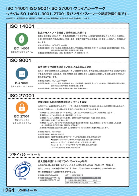 ISO14001・ISO9001・ISO27001・プライバシーマークウチダはISO14001、9001、27001及びプライバシーマーク認証取得企業です。内田洋行は、製品開発とその提供部門の管理システムで国際規格に適合した3つの認証を取得しています。ISO14001ISO14001環境マネジメントシステムISO9001ISO9001品質マネジメントシステムISO27001ISO27001情報セキュリティマネジメントシステム製品アセスメントを配慮し環境保全に貢献する事業活動に伴なうエネルギーや資源の削減を行うだけでなく、取扱い商品の製品アセスメントを実施し、企画・開発段階から商品の製造・流通・使用・廃棄の過程で「地球環境保全」を意識した商品作りを目指しております。●適合証明証No.NQE-20010009A●認証登録範囲オフィス家具、環境設備品、教材、学校設備品、情報機器、及びそれらに関連する設備機器の設計・開発、委託製造品の購入管理、物流管理、施工管理●認証登録事業所の所在地本社・新川第2オフィス・東陽町オフィスお客様からの信頼と満足をいただける品質のご提供当社の「顧客の要求を満たした製品を一貫して提供する能力」が実証され、「顧客満足の向上を目指す企業」であることが認められました。規格の認証を継続・維持しながら、お客様に信頼をいただける企業を目指して、努力を重ねております。●適合証明証No.NQA-20010034A●認証登録範囲オフィス家具、環境設備品、教材、学校設備品、情報機器、及びそれらに関連する設備機器の設計・開発、委託製造品の購入管理、物流管理、施工管理●認証登録組織商品企画、調達、物流管理、施工管理、品質環境部門企業における総合的な情報セキュリティを確保内田洋行は、お客様に安心してサービス・商品をご利用頂くと共に、社会からの信用を得られるよう、内田洋行情報セキュリティ基本方針を定め、これに取り組んでまいります。1.情報セキュリティに関するルールを策定し、これに基づいた情報セキュリティ対策を実施いたします。2.情報セキュリティに関する法令・規制を遵守いたします。3.情報セキュリティに関する体制を整備し、定期的に運用状況の確認・見直しを行うことで、運営の維持・改善を行ってまいります。4.情報セキュリティインシデントを未然に防止することに努めます。また、実際にインシデントが発生した場合も、ルールに基づいた迅速な対応と再発防止に努めます。5.従業者が情報資産を適切に取り扱えるよう情報セキュリティに関する教育を実施いたします。●登録証明証No.IS507337●認証登録組織株式会社内田洋行●認証登録範囲●顧客要求事項に基づくソフトウェア製品の設計、製造、提供及び保守●自主開発パッケージソフトウェアの設計、製造、提供、運用及び保守●パッケージソフトウェア製品のカスタマイズ、導入支援、保守●ネットワーク、ハードウェア等のインフラ構築、設計、導入支援2024年4月21日付適用宣言書第6.5版プライバシーマーク個人情報保護におけるプライバシーマーク取得内田洋行は、個人情報保護マネジメントシステムの要求項目(JISQ15001:2017準拠)を満たしています。内田洋行は2000年7月19日にプライバシーマークを取得してから2024年の付与適格性審査で13回目の更新となりました。●登録番号第10480001号●初回登録日2000年7月19日有効期限日2026年7月18日●Pマーク認証取得状況認証取得状況子会社・関連会社38社中連結対象(持分法含む)20社中Pマーク12社8社1264Vol.20