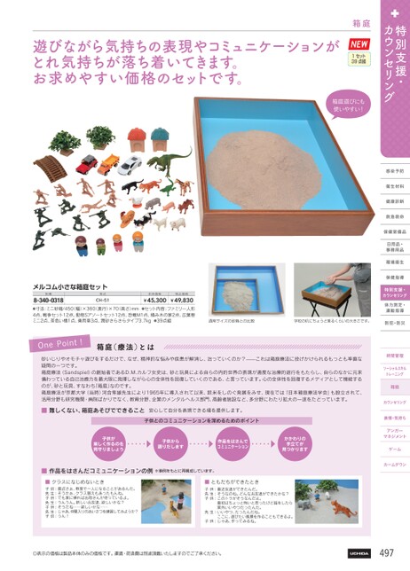 特別支援・カウンセリング感染予防衛生材料健康診断救急救命保健室備品日用品・事務用品環境衛生保健指導特別支援・カウンセリング体力測定・運動指導防犯・防災時間管理ソーシャルスキルトレーニング箱庭カウンセリング表情・気持ちアンガーマネジメントゲームカームダウン497遊びながら気持ちの表現やコミュニケーションがとれ気持ちが落ち着いてきます。お求めやすい価格のセットです。箱庭1セット39点組箱庭遊びにも使いやすい!メルコム小さな箱庭セット型番8-340-0318型式CH-51本体価格税込価格¥45,300¥49,830●寸法:ミニ砂箱/450(幅)×360(奥行)×70(高さ)mm●セット内容:ファミリー人形4点、戦争セット12点、動物Sアソートセット12点、恐竜M1点、積み木の家2点、広葉樹ミニ2点、茶色い橋1点、乗用車3点、潤砂さらさらタイプ3.7kg●39点組OnePoint!箱庭(療法)とは通常サイズの砂箱との比較学校の机にちょうど乗るくらいの大きさです。砂いじりやオモチャ遊びをするだけで、なぜ、精神的な悩みや疾患が解消し、治っていくのか?̶̶これは箱庭療法に投げかけられるもっとも率直な疑問の一つです。箱庭療法(Sandspiel)の創始者であるD.M.カルフ女史は、砂と玩具による自らの内的世界の表現が適度な治療的退行をもたらし、自らのなかに元来備わっている自己治癒力を最大限に発揮しながら心の全体性を回復していくのである、と言っています。心の全体性を回復するメディアとして機能するのが、砂と玩具、すなわち「箱庭」なのです。箱庭療法が京都大学(当時)河合隼雄先生により1965年に導入されて以来、欧米をしのぐ発展をみせ、現在では「日本箱庭療法学会」も設立されて、活用分野も研究機関・病院ばかりでなく、教育分野、企業のメンタルヘルス部門、高齢者施設など、多分野にわたり拡大の一途をたどっています。■難しくない、箱庭あそびでできること安心して自分を表現できる場を提供します。子供とのコミュニケーションを深めるためのポイント子供が楽しく作るのを見守りましょう子供から語りだします作品をはさんでコミュニケーション■作品をはさんだコミュニケーションの例※事例をもとに再構成しています。かかわりの手立てが見つかります■クラスになじめないとき子供:先生:子供:先生:子供:先生:子供:最近さぁ、教室で一人になることがあるんだ。そうかぁ、クラス替えもあったもんね。でも家に帰ればお母さんが待っているよ。うんうん。新しいお友達、欲しいかな?そうだね……欲しいかな……じゃあ、仲間入りのあいさつを練習してみようか?うん!■ともだちができたとき最近友達ができたんだ。子供:そうなのね。どんなお友達ができたかな?先生:このトラがそうなんだよ。子供:最初はちょっと怖いと思ったけど話をしたら案外いいやつだったんだ。いいやつ、だったんだね。ここに、遊びたい風景を作ることもできるよ。じゃあ、作ってみるね。先生:子供:◎表示の価格は製品本体のみの価格です。運賃・荷造費は別途頂戴いたしますのでご了承ください。