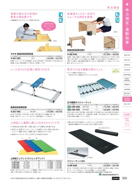 体力測定・運動指導感染予防衛生材料健康診断救急救命保健室備品日用品・事務用品環境衛生保健指導特別支援・カウンセリング体力測定・運動指導防犯・防災体力測定歩数計・心拍計バランスボールフィットネス安価で組み立て計測が簡単な測定器です。●検査者がいなくても、1人で測定できます。直進型キャスター方式でスムーズな測定を実現。文部科学省スポーツテスト対応。体力測定使用例使用例長座体前屈測定器型番8-303-1003型式UA-1本体価格税込価格¥24,300¥26,730●材質:スチール、アルミ(粉体塗装)●寸法:600(幅)×1300(長さ)×250(高さ)mm●質量:6.8kg●測定範囲:0〜800mm●床敷シート付レール式でより正確に測定できます。長座体前屈測定器5型番8-306-8184型式T1817高さ調節が2段階。本体価格税込価格¥27,300¥30,030●材質:木製、抗菌クリア塗装(汚れ、傷が目立ちにくい非光沢仕上げ)●寸法:620(幅)×295(奥行)×310(全高)mm●質量:3.1kg●大型デジタル回転カウンター採用(1cm単位)●高さ調節2段階(25・30cm)●測定範囲:0〜99cm、メモリ1cm単位●ゴムキャスター付屋内での立ち幅跳び用のマット。●マット表面には目安として200mmごとに目盛りをプリントしています。ノンスリップ立ち幅跳びメジャーマット型番8-300-43008-300-4302型式UM-4165UM-4865種別3m2.4m本体価格,700¥75¥63,600税込価格¥83,270¥69,960●寸法:UM-4165/1200(幅)×3000(長さ)×50(厚さ)mm、UM-4865/1200(幅)×2400(長さ)×50(厚さ)mm〈共通仕様〉●材質:中芯/合成スポンジ(厚さ50mm)、外皮/6号帆布(裏面ノンスリップ加工)●厚さ4mmのPVC発泡シートはクッション性に優れ、着地時の衝撃をやわらげます。丸めて収納できます。丸めて収納できます。長座体前屈測定器型番8-303-1005型式EKJ-091本体価格税込価格¥37,000¥40,700●寸法:600(幅)×1300(長さ)×250・300(高さ)mm●質量:約5.1kg●材質:天板/スチール、レール・柱/アルミ●測定範囲:0〜1000mm上体起こし運動に適した大きさのマットです。●1枚約2kgと非常に軽く、児童・生徒1人でも簡単に持ち運べます。●芯材には、特殊ポリエチレンフォームを使用しており、優れた耐久性とストレッチ運動、体ほぐし運動に適した弾性をもっています。●表皮のナイロンターポリンは汚れても水拭きできます。赤青緑黄上体起こしマット(ストレッチマット)型番8-300-42008-300-42018-300-42028-300-4203型式SS-262RSS-262YSS-262BLSS-262G種別赤黄青緑本体価格¥11,000¥11,000¥11,000¥11,000税込価格¥12,100¥12,100¥12,100¥12,100●材質:中芯/ポリエチレンフォーム(軽量型)、表皮/ナイロンターポリン●寸法:600(幅)×1800(長さ)×20(厚さ)mm●質量:2kgメジャーマット3M型番8-306-8356使用例型式T1813本体価格税込価格¥23,800¥26,180●寸法:1000(幅)×3500(長さ)×4(厚さ)mm●材質:PVC発泡●質量:約3kg●メジャーラインは50cm〜1m/10cm間隔、1〜3m/5cm間隔※マット上のラインは目安です。正確な測定を要する場合は実測にて対応願います。は製品安全協会認定品です。◎表示の価格は製品本体のみの価格です。運賃・荷造費は別途頂戴いたしますのでご了承ください。509